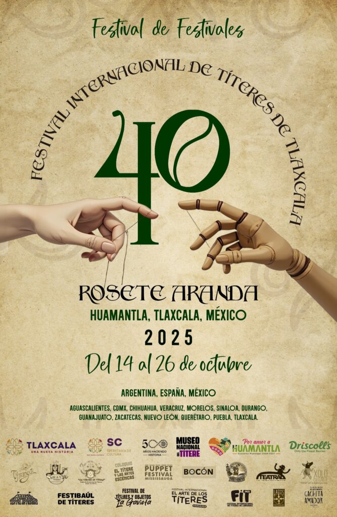 El Festival Internacional de Títeres de Tlaxcala Rosete Aranda 2025, también conocido como el “Festival de Festivales”, se realizará del 14 al 26 de octubre con un programa de 60 funciones gratuitas que se distribuirán en 16 municipios del estado. Esta edición número 40 reunirá a grupos de titiriteros de 12 estados de México, así como de Argentina, Canadá y España, consolidándose como una de las celebraciones culturales más longevas del país.